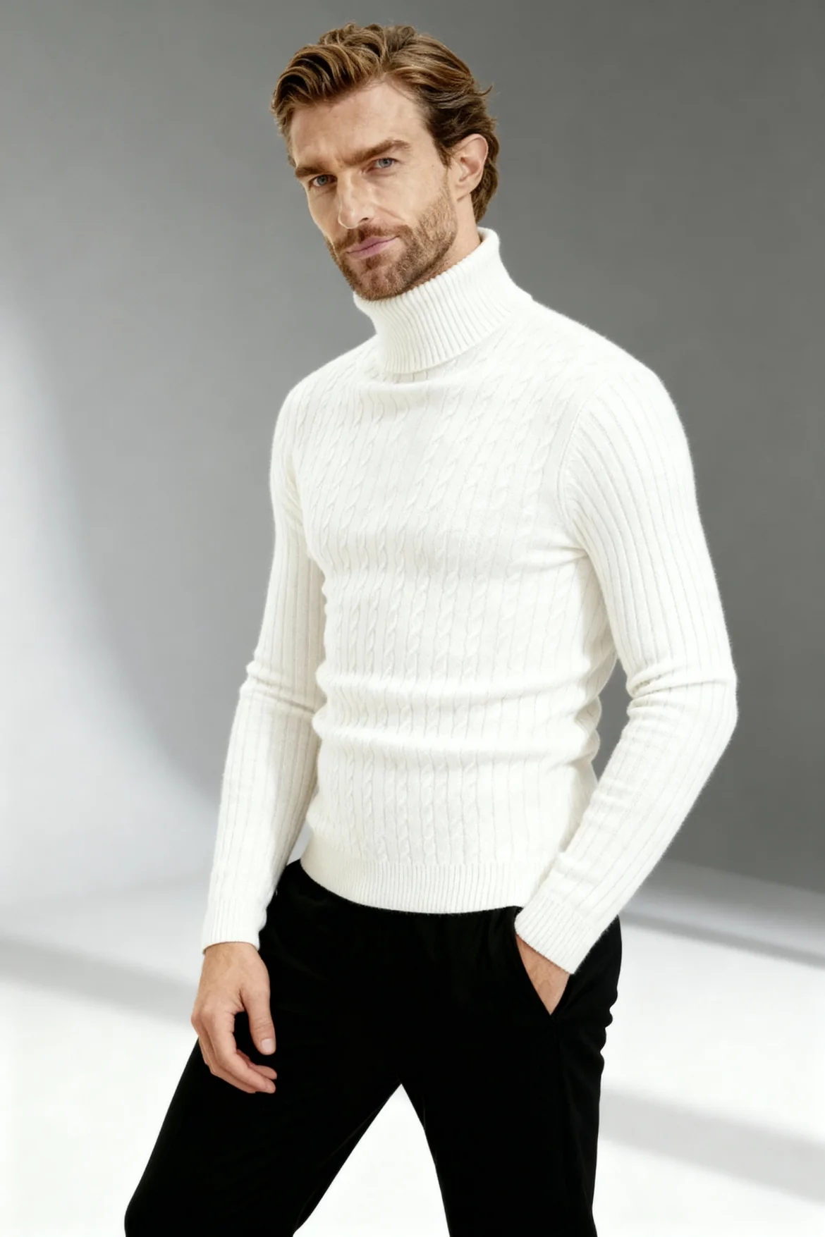Dieser Rollkragenpullover mit Kabelstrickmuster ist ein Kleidungsstück für den täglichen Gebrauch bei kühleren Temperaturen. Er verfügt über ein strukturiertes Strickdesign sowie Rippbündchen an Ärmeln, Saum und Halsausschnitt für eine gleichmäßige Passform.
