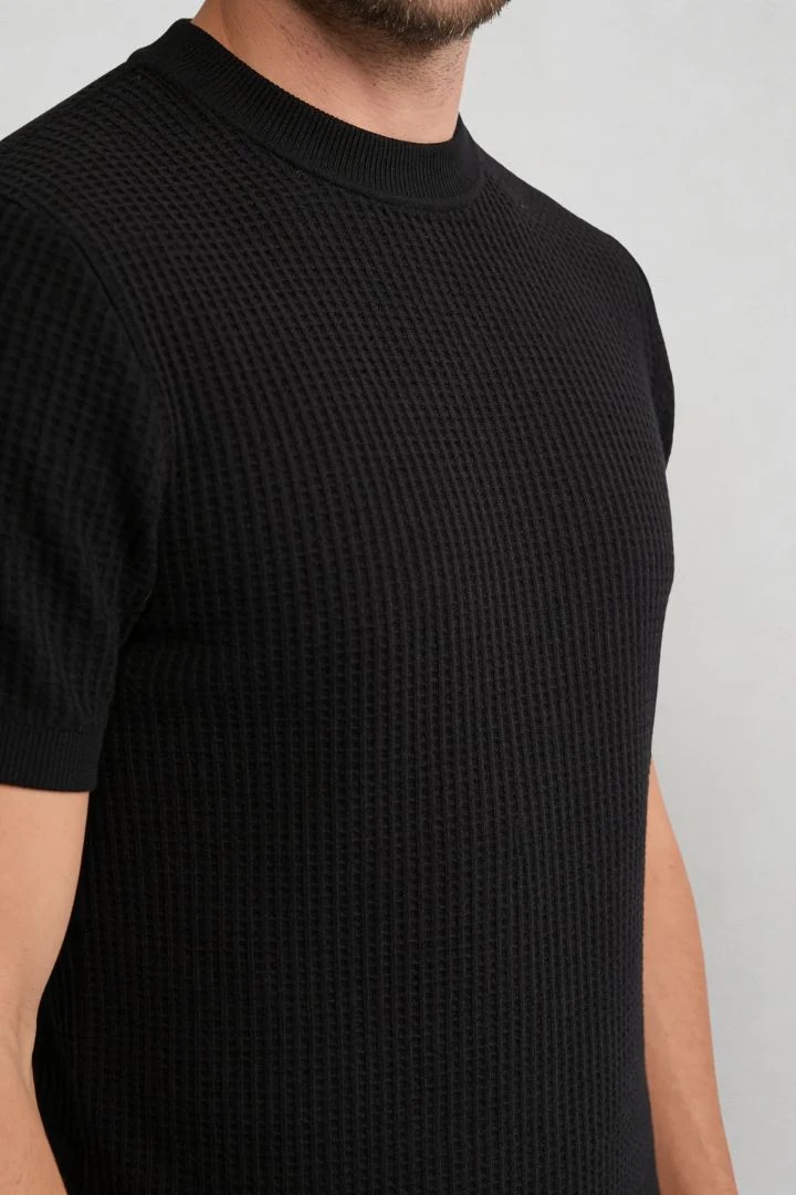 Dieses Strick-T-Shirt aus Baumwolle ist ein Kleidungsstück für den täglichen Gebrauch bei warmen Temperaturen. Es verfügt über eine strukturierte Strickoberfläche sowie gerippte Abschlüsse an Kragen und Ärmeln für eine gleichmäßige Passform. Die Passform ist schlank geschnitten und unterstützt eine klare Silhouette.